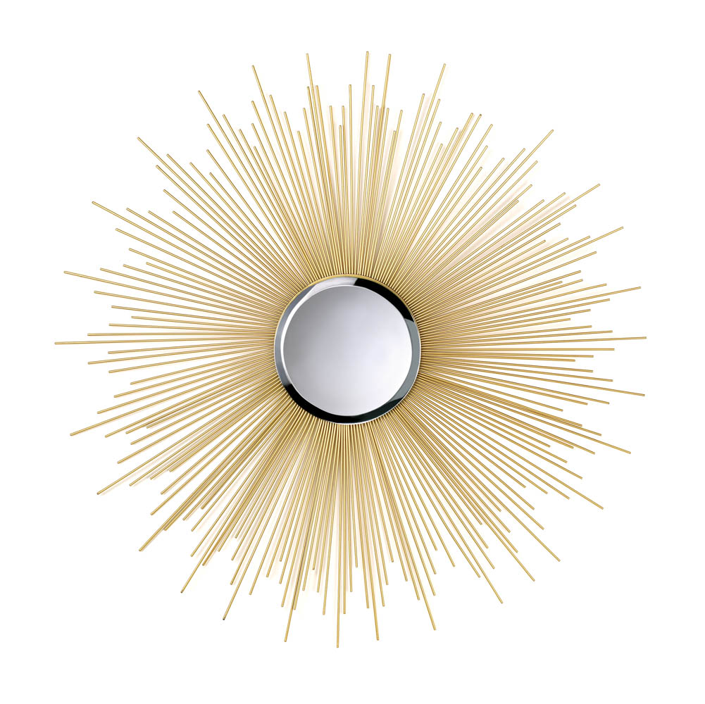 • A stunning addition to any room, this gorgeous mirror takes a touch of vintage style and makes a modern masterpiece. It features a beveled mirror inset in a burst of shimmering golden rays. A great housewarming gift or personal home décor piece!