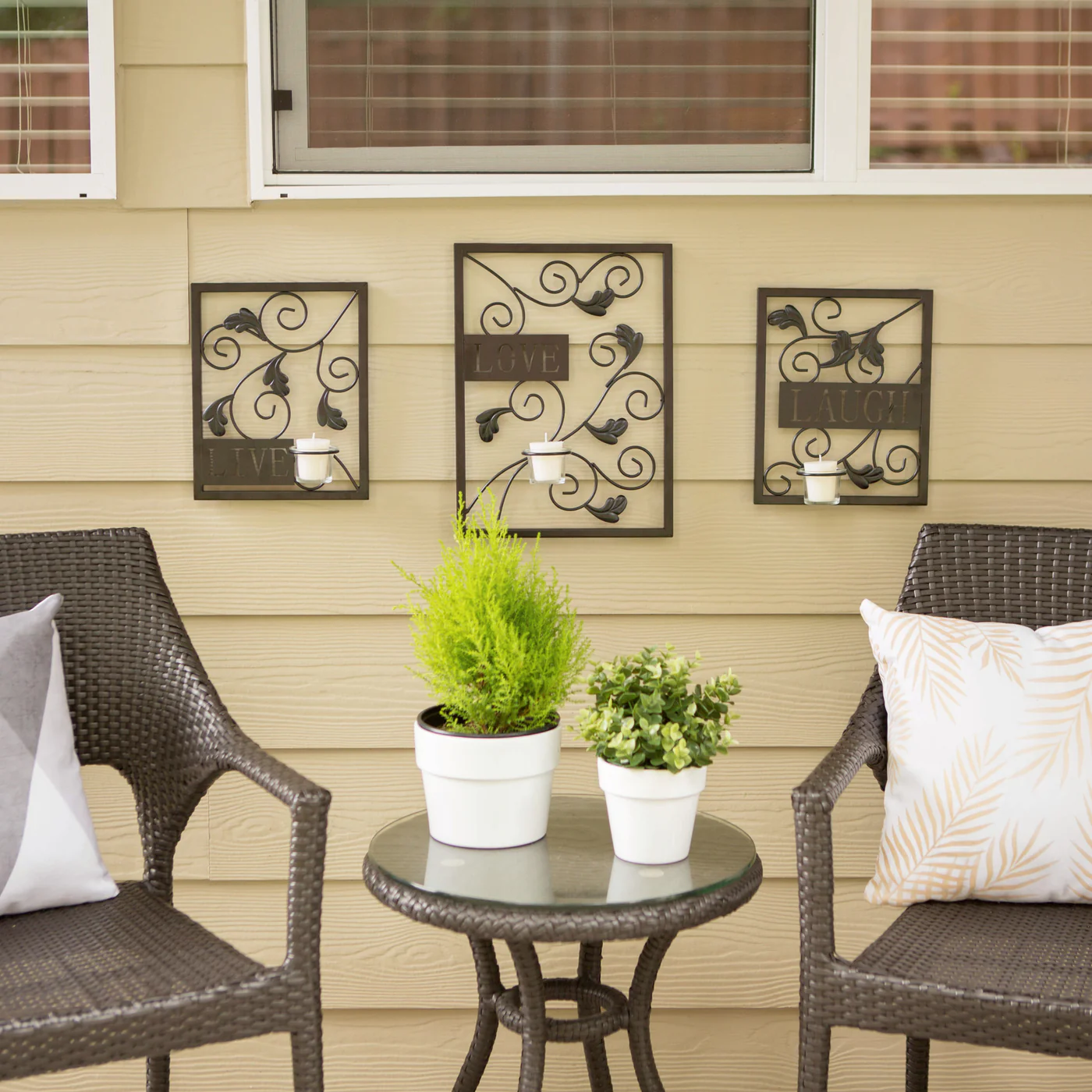 • Remind yourself what's important everyday with this splendid set of three candleholder wall plaques. Made from dark metal, each piece carries a clear glass candle cup and a wise word, "Live, Love, Laugh."