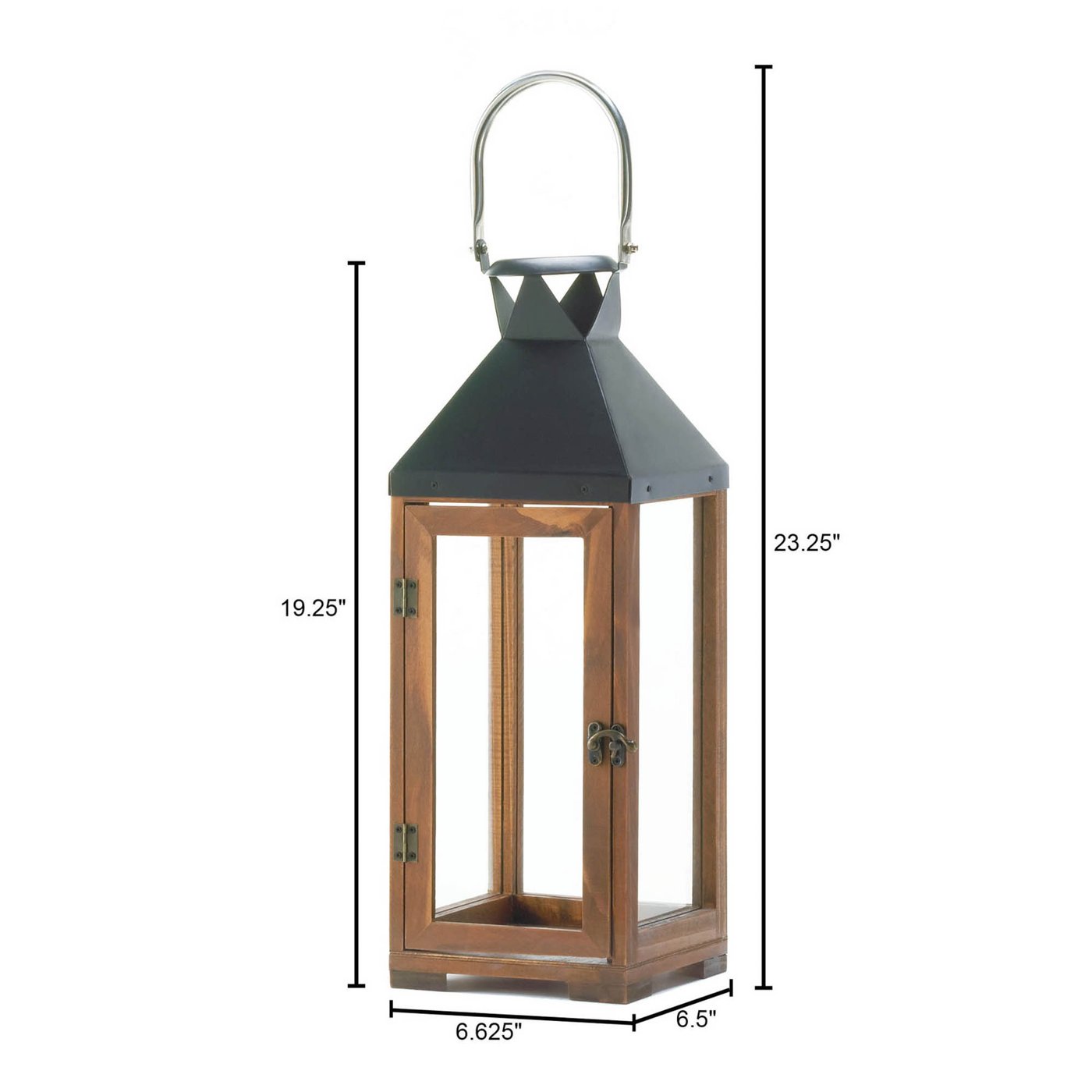 • The harmony of elegant wood and sleek black metal makes this tall candle lantern a designer's dream come true. The clear glass panels let candlelight shine brightly, and the oversized stainless steel hanging loop is the perfect finishing touch.
