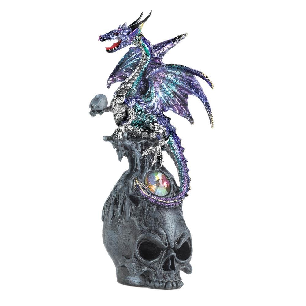 • With a dazzling purple and aqua dragon is perched atop a skull, complete with a brilliant faceted jewel this piece is a must have for any fantasy lover. This mesmerizing décor piece is an excellent gift and will look stunning perched on a shelf, desk, or table.