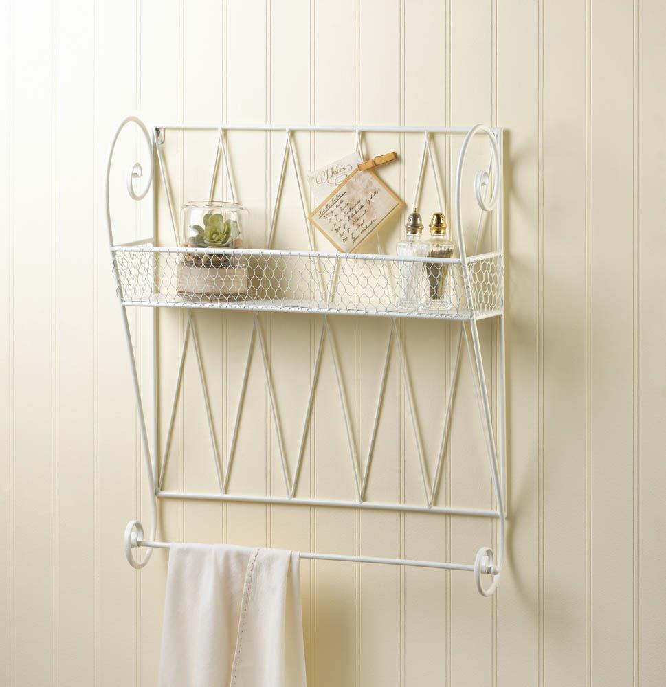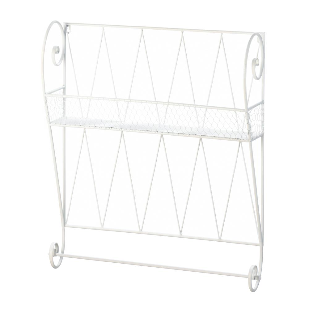 • This pretty wall-mounted iron wall shelf is ready to add more display space to your room plus a dash of whitewashed style. It features a small shelf on top and a bar across the bottom that can also be used for hanging decorative items or a tea towel.