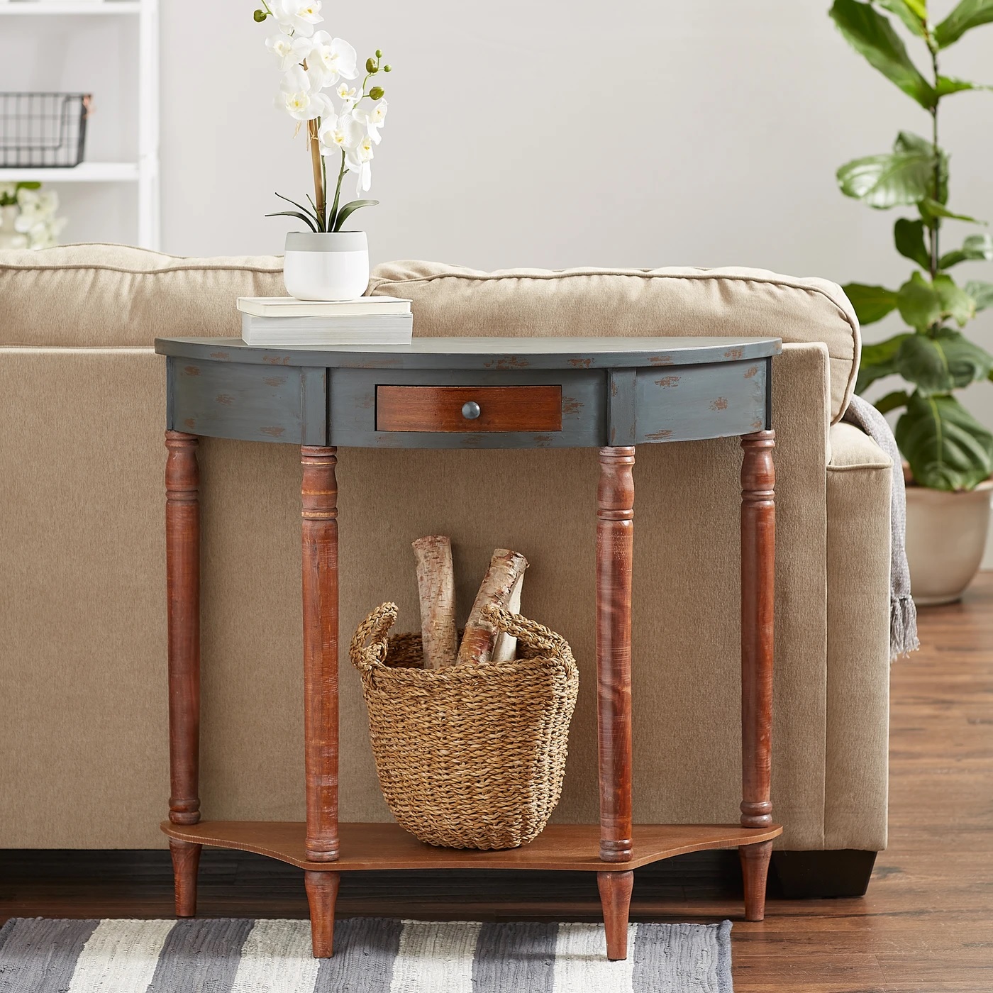 • This beautiful hall table looks like a timeworn family treasure passed down through generations. The half-moon shape is perfect for your entry way or hall to add style and a little bit of storage. It features a pullout drawer and display shelf below.