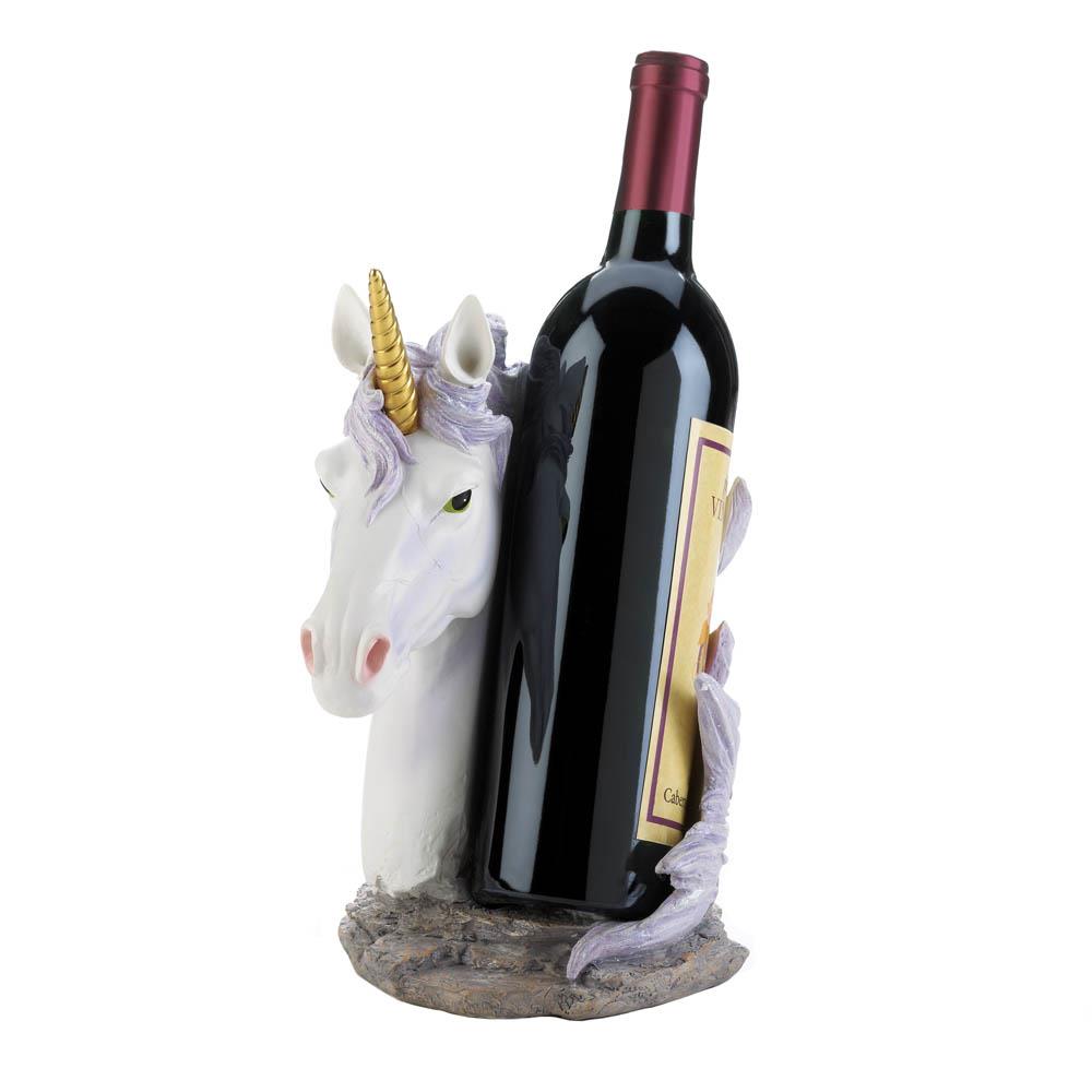 • A magical bar helper, this unicorn bottle holder makes an enchanted statement. The white unicorn bust is detailed with a gold horn and lavender mane which is highlighted with glittery touches. It's an enchanting gift for fairy art collectors and enthusiasts.