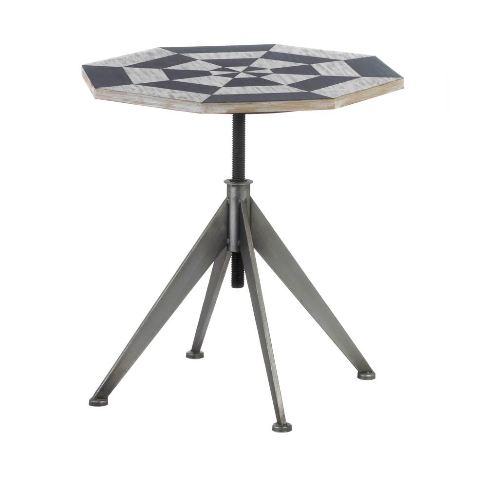 The Black and White Checker Accent Table offers a striking yet simple design with an octagon shaped wooden top and a four-legged metal base. HEIGHT ADJUSTMENT REQUIRED PRIOR TO USE.