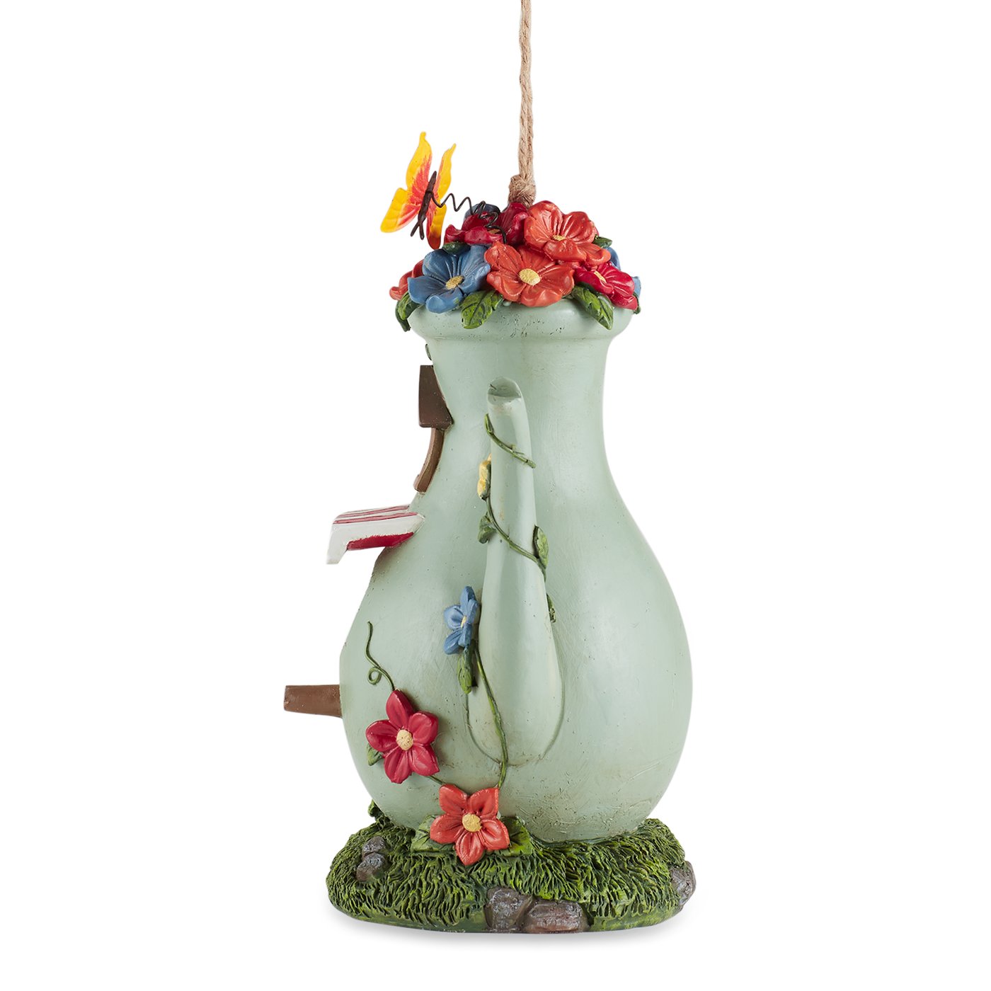 • This adorable teapot birdhouse will add colorful charm to your outdoor space while providing a fun home for the birds in your yard.
