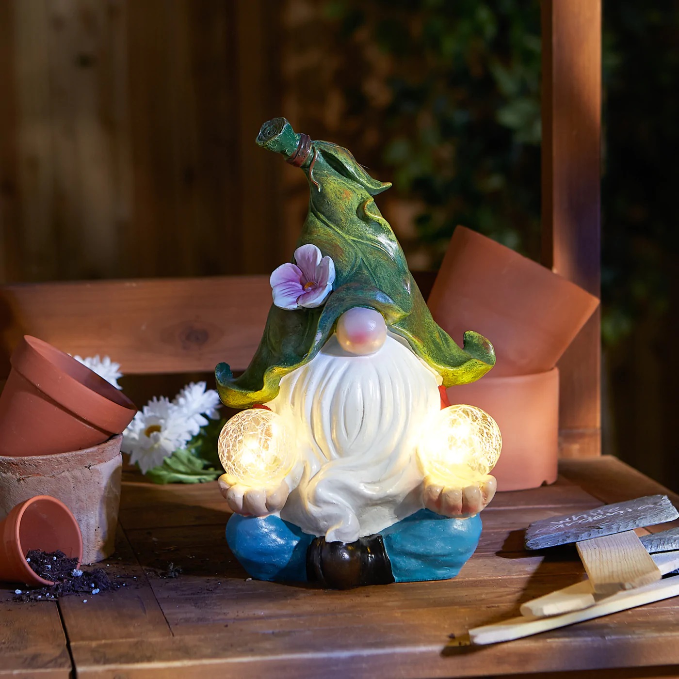 • Make your garden feel whimsical and filled with magic and wonder with this adorable gnome statue. He's sitting peacefully holding two crackled solar orbs that will softly light your garden in the evening with the help of the solar panel hidden in hat made of garden leaves.