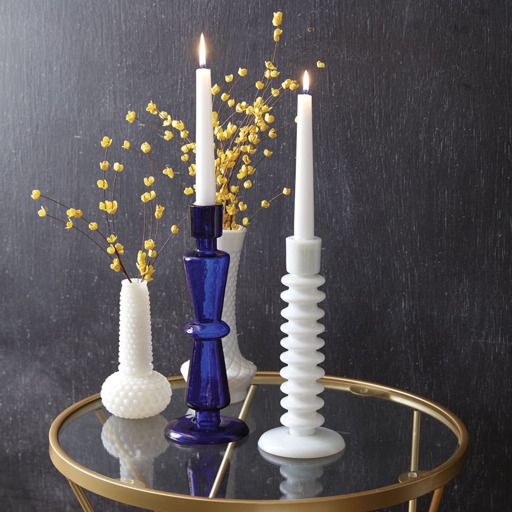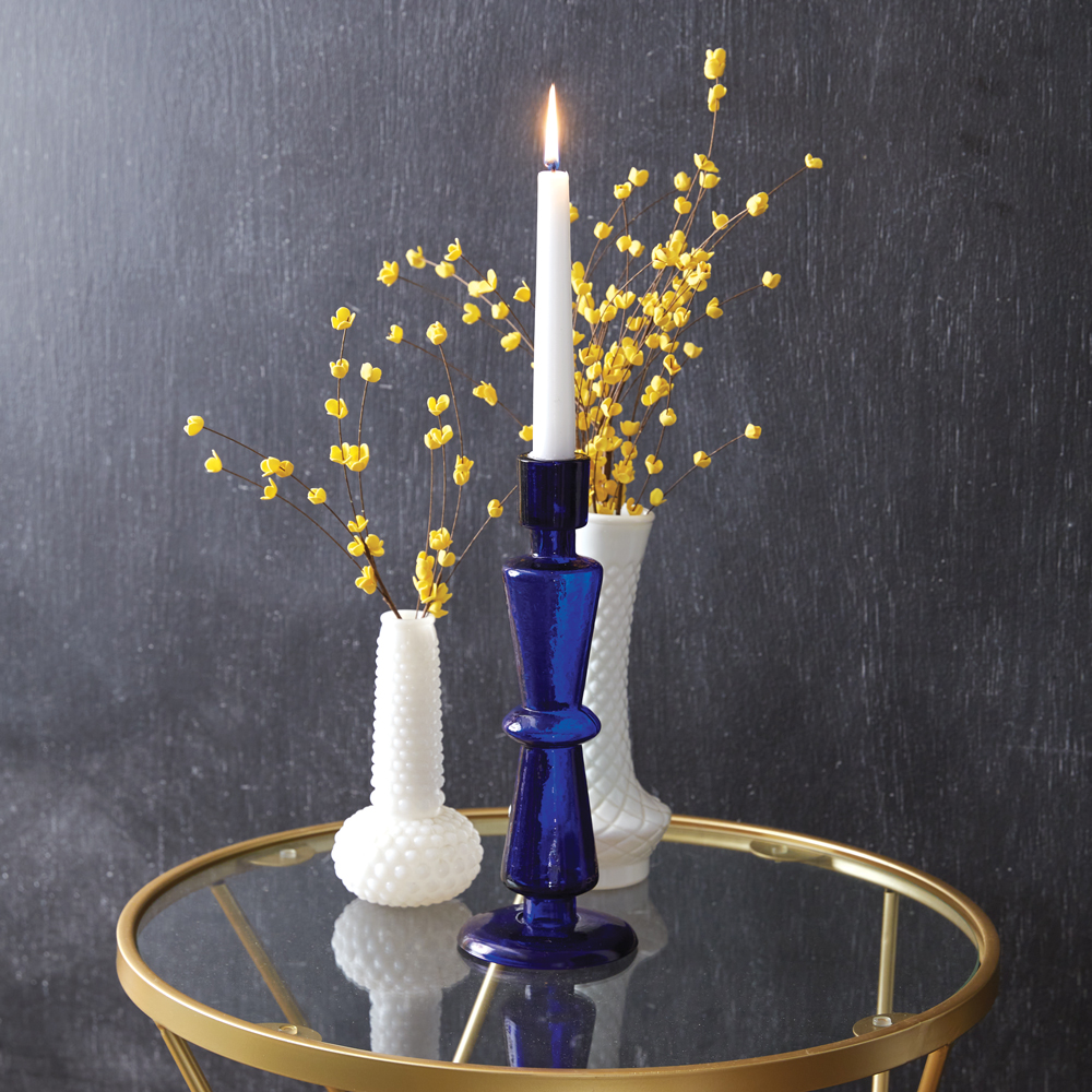 Add a pop of color to your tablescape with this unique glass taper candle holder. It's shown with a standard wax taper candle, not included.